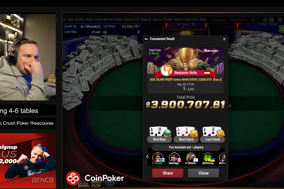 The tournament, which took place on GGPoker, saw a massive turnout with 5,961 unique entries across multiple starting flights. The $5,000 buy-in event created a prize pool of $28,314,750, with the top prize set at $3,900,707. Rolle’s journey to victory was no easy feat, but his skill and determination led him to overcome early challenges to secure the win.