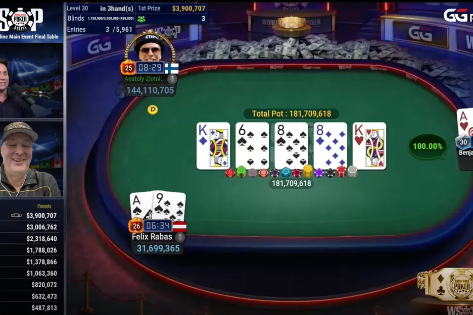 When heads-up play began, Zlotnikov held a slim chip lead. But Rolle wasted no time in taking control. In the defining hand of the final table, Zlotnikov opened from the button with pocket eights, and Rolle made a bold three-bet with ace-king suited. Zlotnikov moved all-in, and Rolle quickly called, confident in his hand. The flop saw both players hit top pair, but Rolle’s ace-high kicker secured the pot and a commanding chip lead.