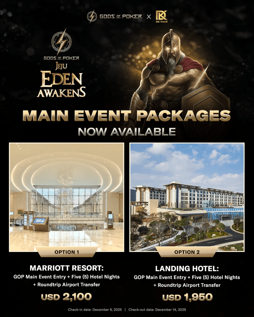 Poker travel doesn’t have to mean juggling hotels and taxis. To simplify things, GOP is offering Main Event Packages that include a five-night stay (Dec 9–14) at either the Jeju Shinhwa World Marriott Resort or Landing Hotel, plus roundtrip airport transfers.