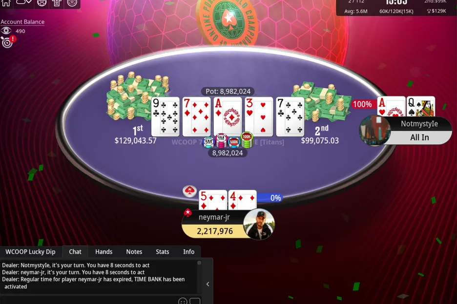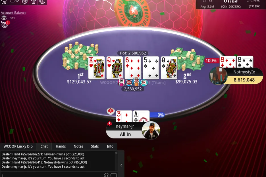 However, Neymar was resilient. He regrouped and found a nut flush to climb back to 7.5 million chips. But NotmystyIe wasn’t done yet. Using a pocket pair of eights, he turned the tide, and the battle for the WCOOP title intensified.